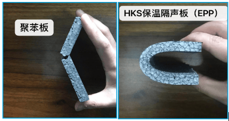 全面可彎曲:XPS、EPS(聚苯板)受力易斷裂,而HKS保溫隔聲板(EPP)可以實(shí)現(xiàn)180°彎曲。